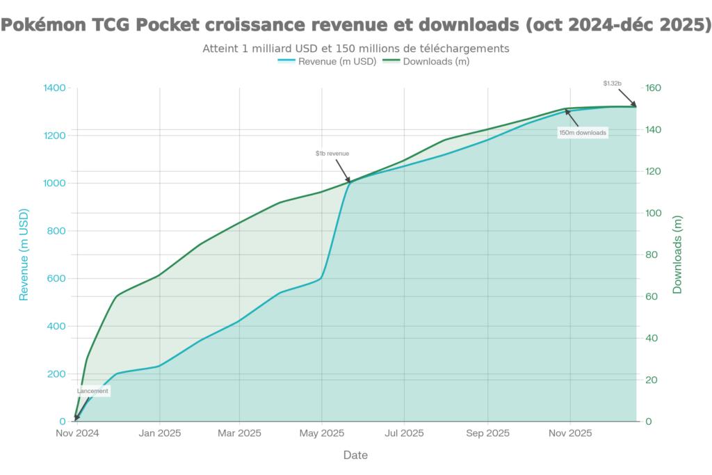 Pour contextualiser : Pokémon GO a mis 282 jours pour atteindre le milliard. Pokémon TCG Pocket l’a fait en 204 jours—78 jours plus rapidement. Cela représente une moyenne de $8,66 par téléchargement, soit une monétisation extraordinairement élevée.